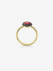 A Heart-Shaped Ruby Button Back Ring with a 2.01ct heart-shaped ruby, set in a Georgian style cut-down setting in 18K blackened white gold & yellow gold.